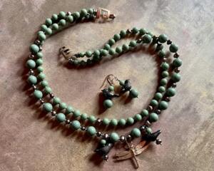 Necklace set | Retro green glass beads, lampwork birds, bronz...