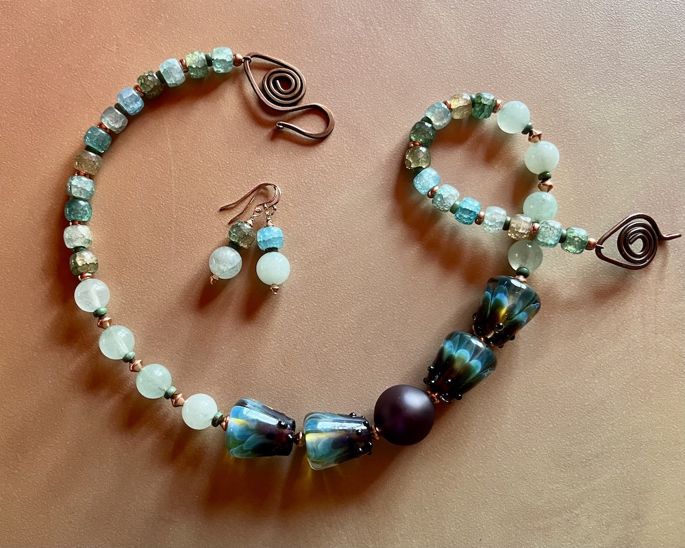 Necklace set | Artisan flower bud glass beads, hollow blown glass focal bead, Burma jade, "ocean glass" cubes, spiral copper clasp